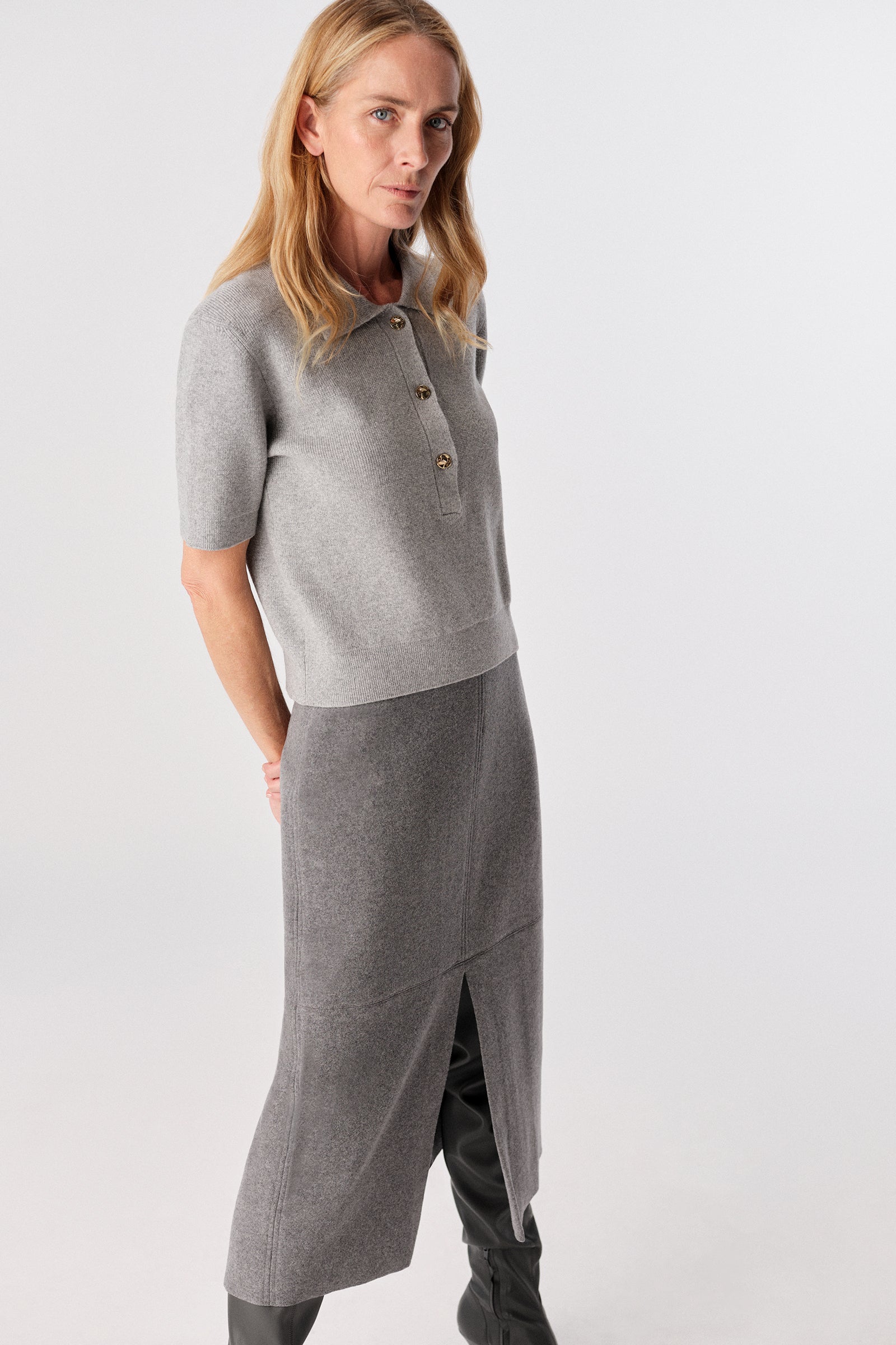 Sequin cashmere polo sweater, low shoulders and short sleeves, loose fit with straight ribbed hem.