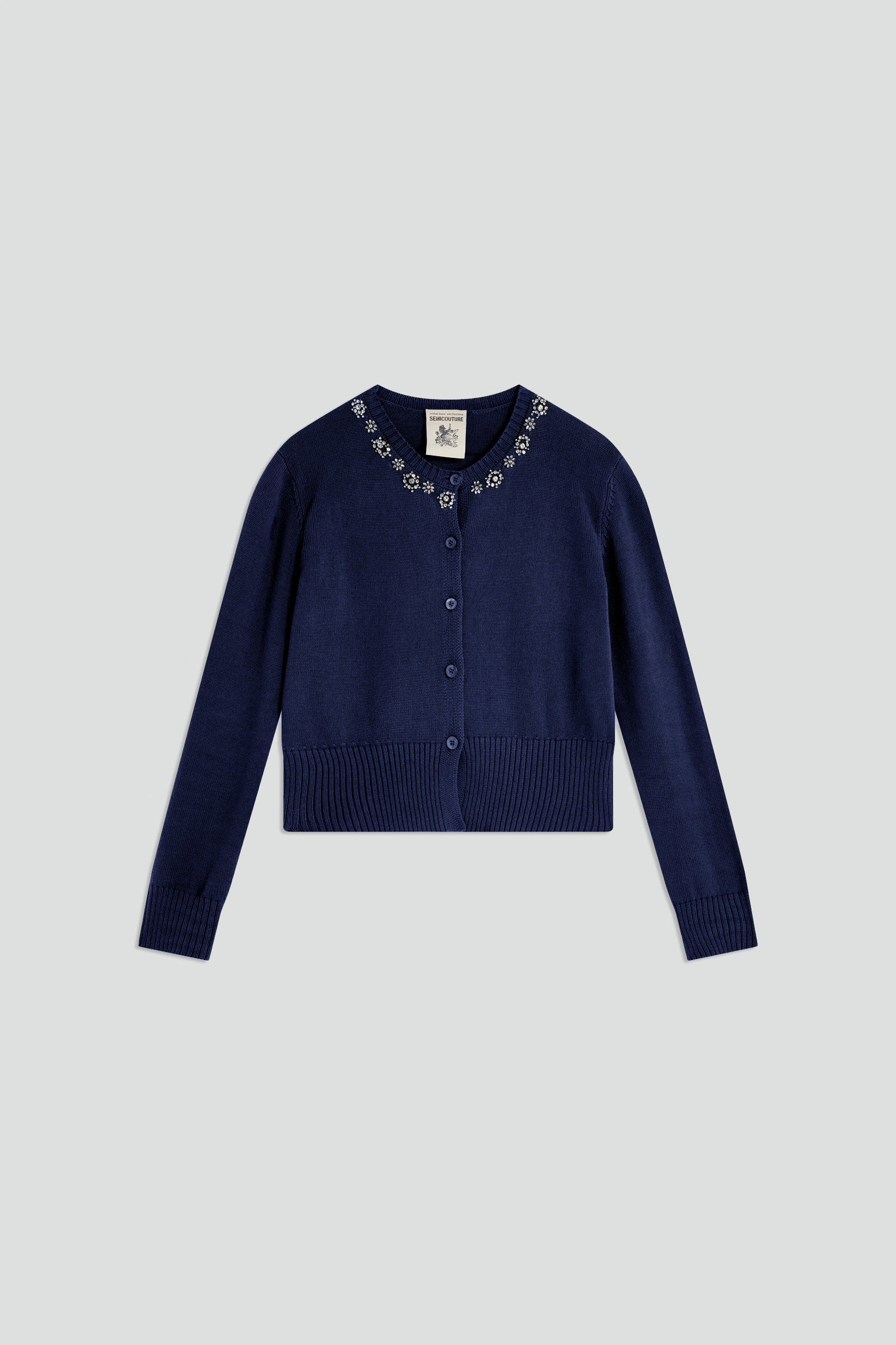 Plain cotton jersey, long sleeve. Round neck, ribbed cuffs, hem and collar. All-over rhinestone embroidery. Hip length, regular fit.