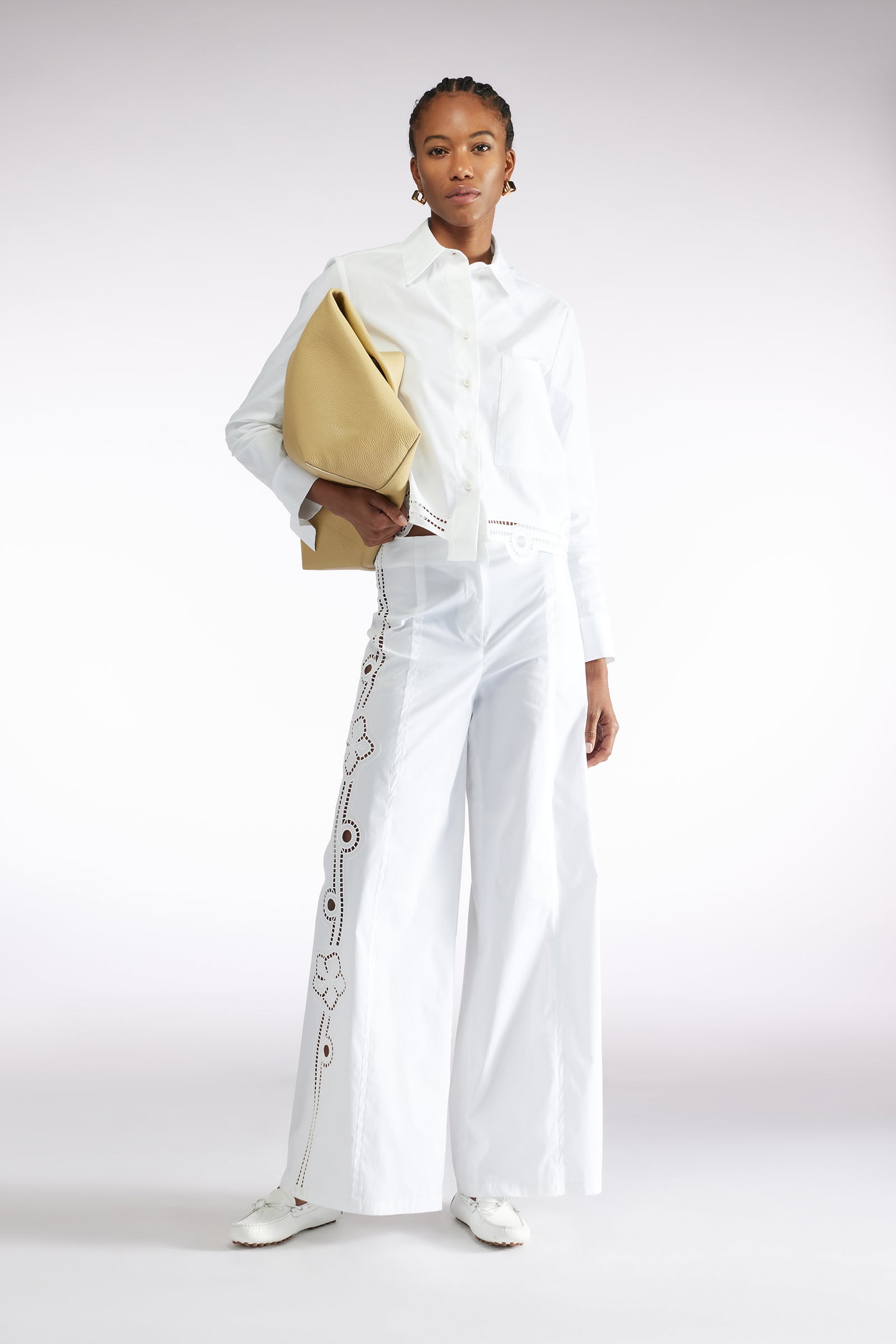 Pantaloni palazzo in tela di cotone, ricamo pizzo sangallo, chiusura con zip frontale e controbottone. Vestibilità regular