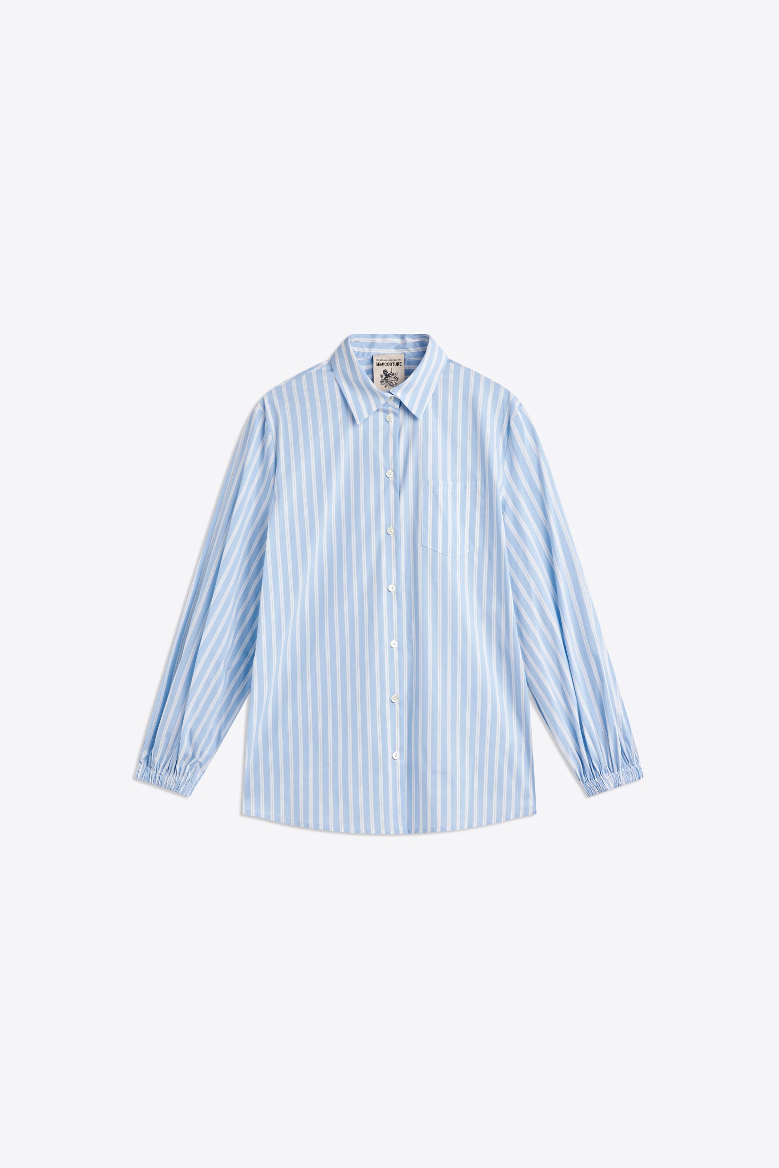Abito in popeline rigato a manica lunga, spalla scesa e polsino basso. Colletto alla coreana, chiusura frontale nascosta, con bottoni. Lunghezza sopra al ginocchio, volume regular.