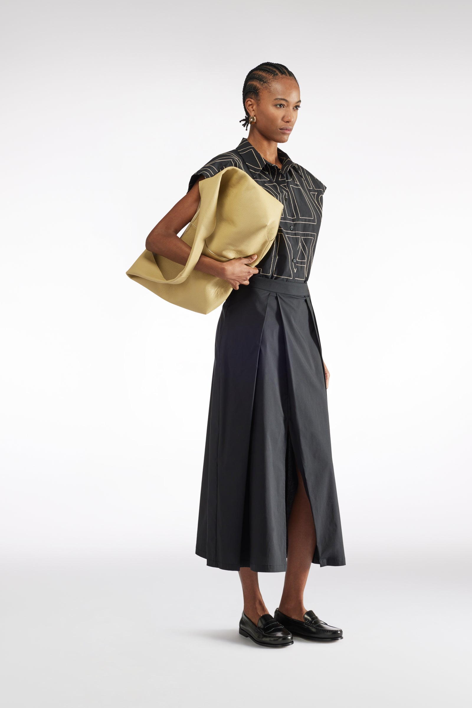 Gonna lunga in gabardina cotone, chiusura asimmetrica frontale con gancio, controbottone e zip, passanti in vita, tasca laterale doppio filetto con patta, spacco al centro davanti.