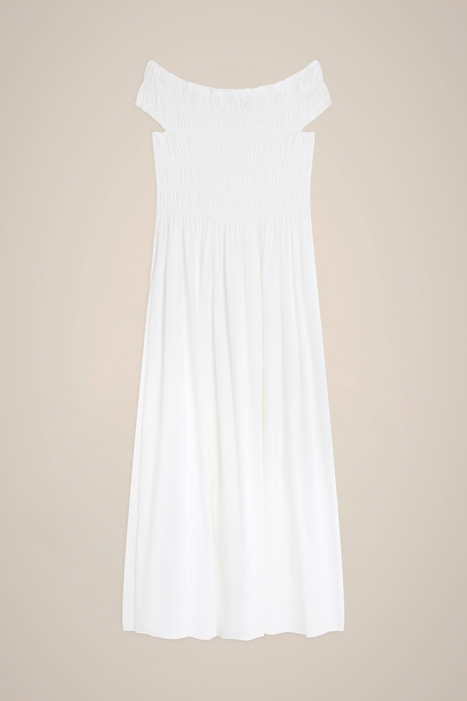 Abito lungo in 100% lino effetto plissé, scollo a V con fettuccia intrecciata, spalline con fettuccia intrecciata, taglio in vita con cintura intrecciata, ampia gonna con spacco al centro davanti.