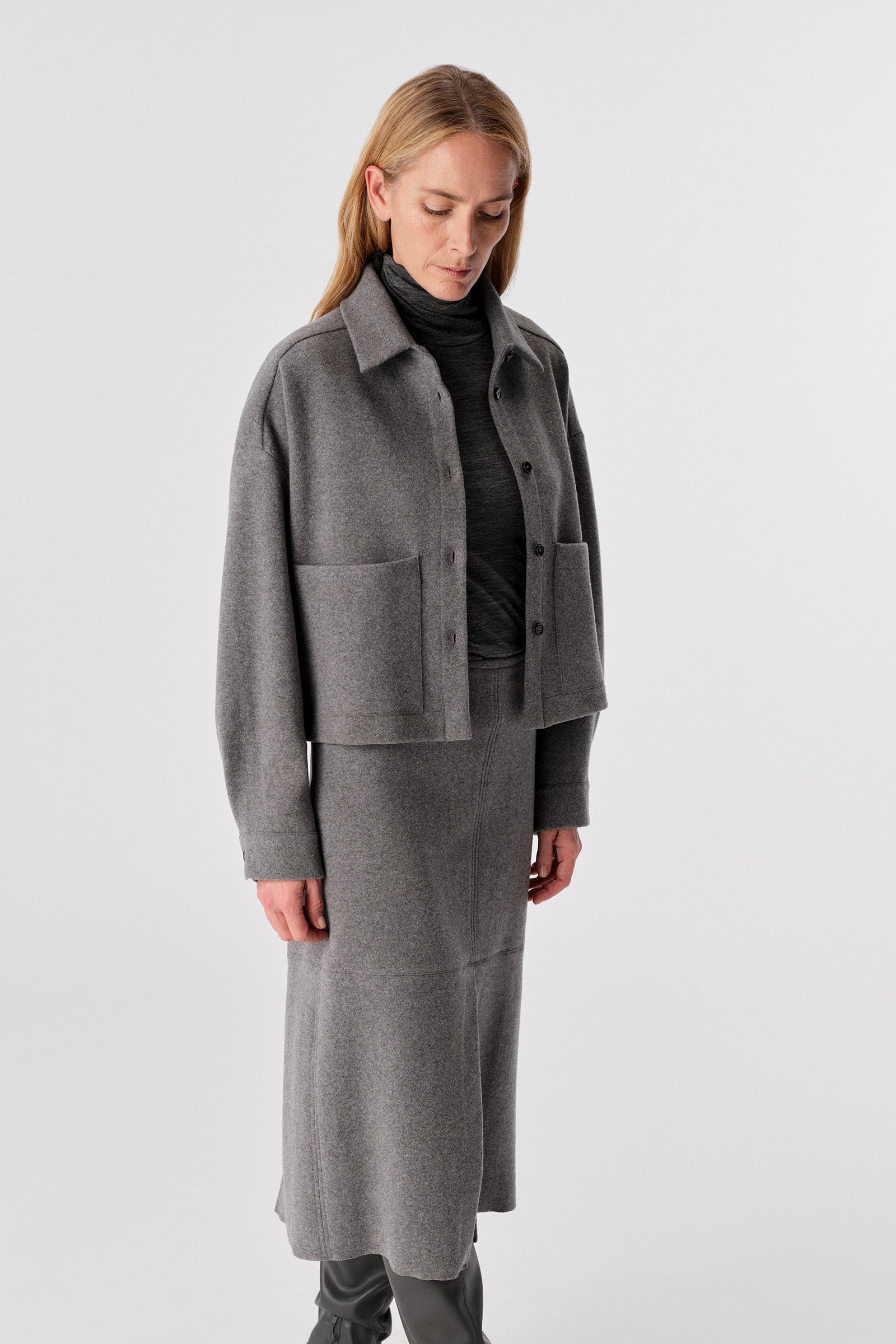 Cappotto monopetto in lambswool, con colletto, abbottonatura frontale, spalla bassa, manica lunga, tasche a toppa frontali.