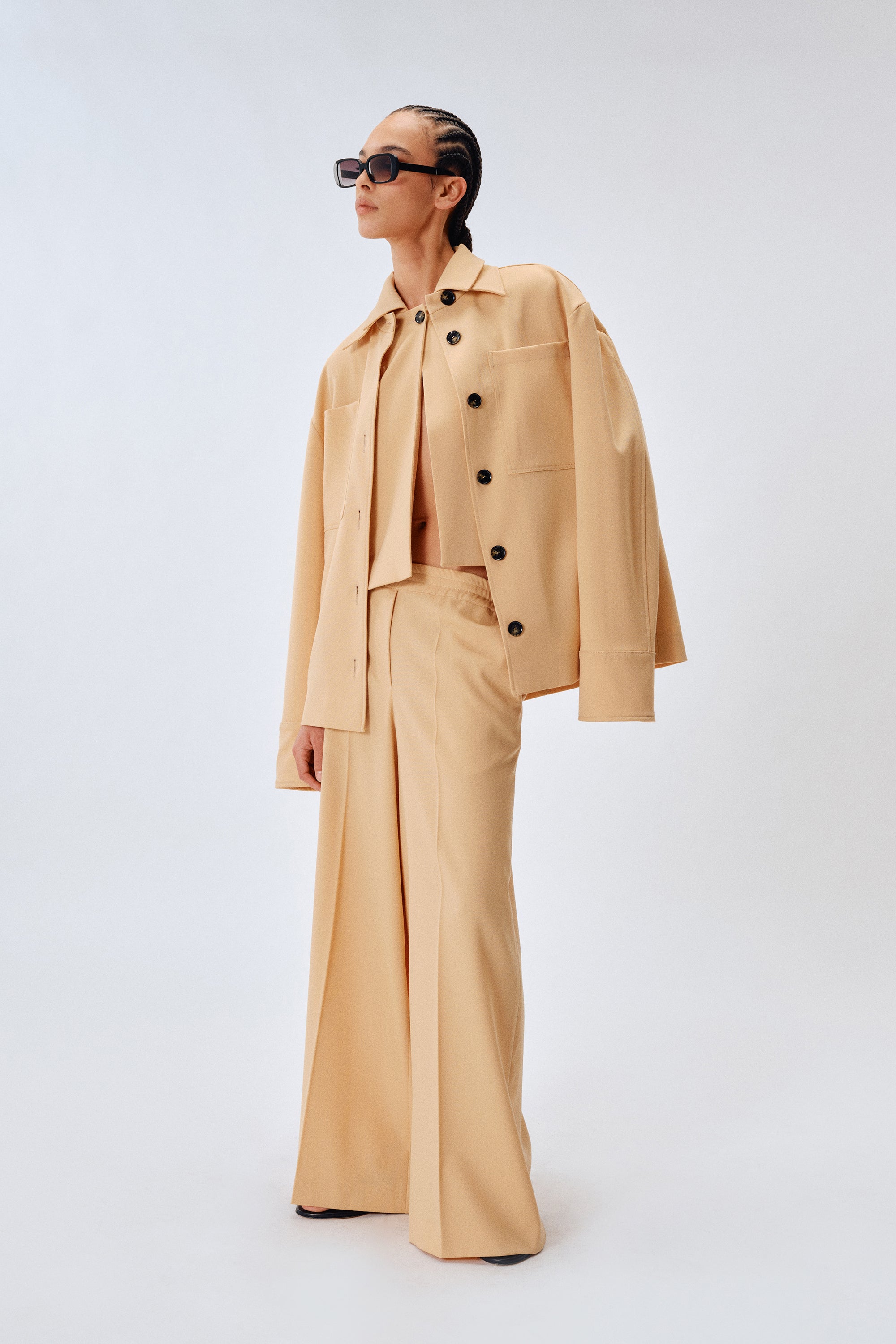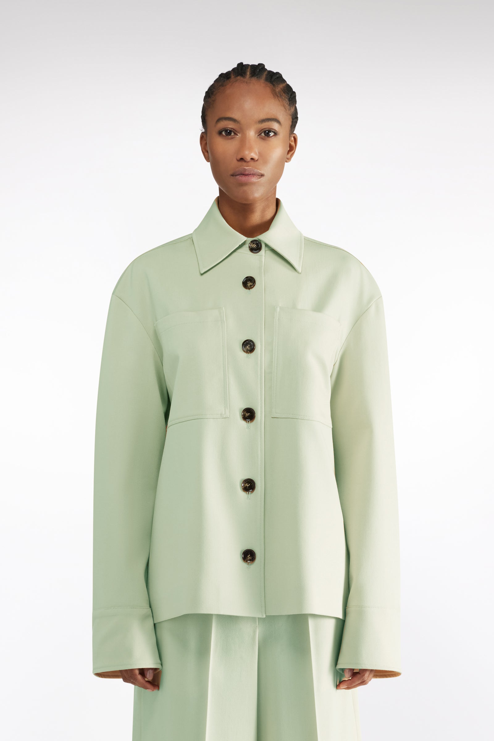 Giacca in gabardina lana, colletto classico, chiusura frontale con bottoni e due tasche applicate sul petto, manica lunga con polso alto.